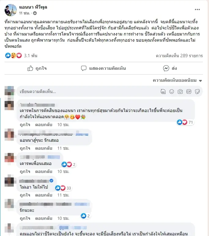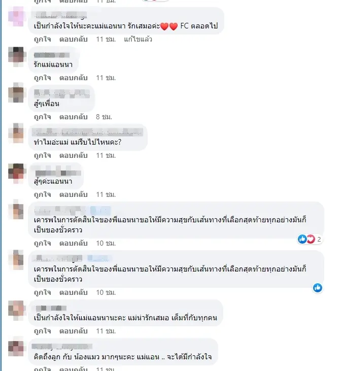 โพสต์นี้มีคนเข้าไปให้กำลังใจทางด้านของแอนนาเป็นจำนวนมาก และ เคารพทุกการตัดสินใจของแอนนาเอง บางส่วนก็บอกให้แอนนารีบกลับมาแก้ไขในส่วนที่ผิด และเริ่มต้นใหม่ ทีมข่าวบันเทิง ไบรท์ทูเดย์ ก็ขอเป็นกำลังใจให้กับแอนนา ผ่านพ้นมรสุมในช่วงนี้ไปได้โดยเร็วนะคะ