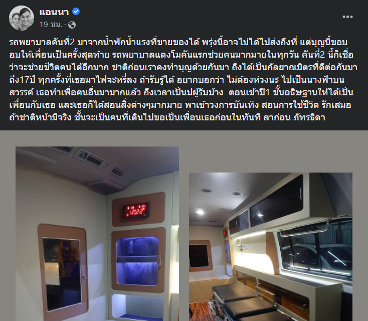 แอนนา เผยความตั้งใจกับรถพยาบาลคันที่ 2 ซึ่งมาจากน้ำพักน้ำแรงของตนเอง เปิดใจ อาจไม่ได้ไปส่ง แตงโม นิดา แต่บุญนี้ขอมอบให้เพื่อนเป็นครั้งสุดท้าย