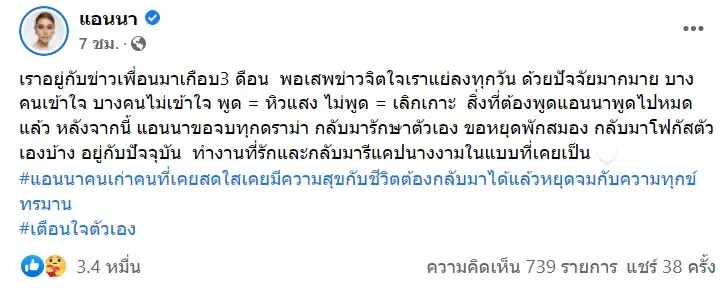 แอนนา เพือนสนิท แตงโม นิดา โพสต์เฟซบุ๊กอยู่กับข่าวเพื่อนมา 3เดือน หลังจากนี้จะขอจบดราม่า และหันมาโฟกัสตัวเอง