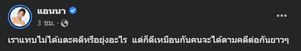 ซึ่งภายหลังจากประเด็นดังกล่าวถูกนำเสนอออกไป แอนนา ก็ได้ออกมาเคลื่อนไหวผ่านทางเพจเป็นที่เรียบร้อยแล้ว โดยระบุว่า เราแทบไม่ได้แตะคดีหรือยุ่งอะไร แต่ก็ดีเหมือนกันคนจะได้ตามคดีต่อกันยาวๆ