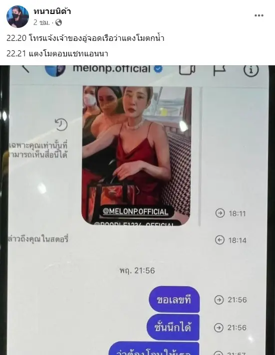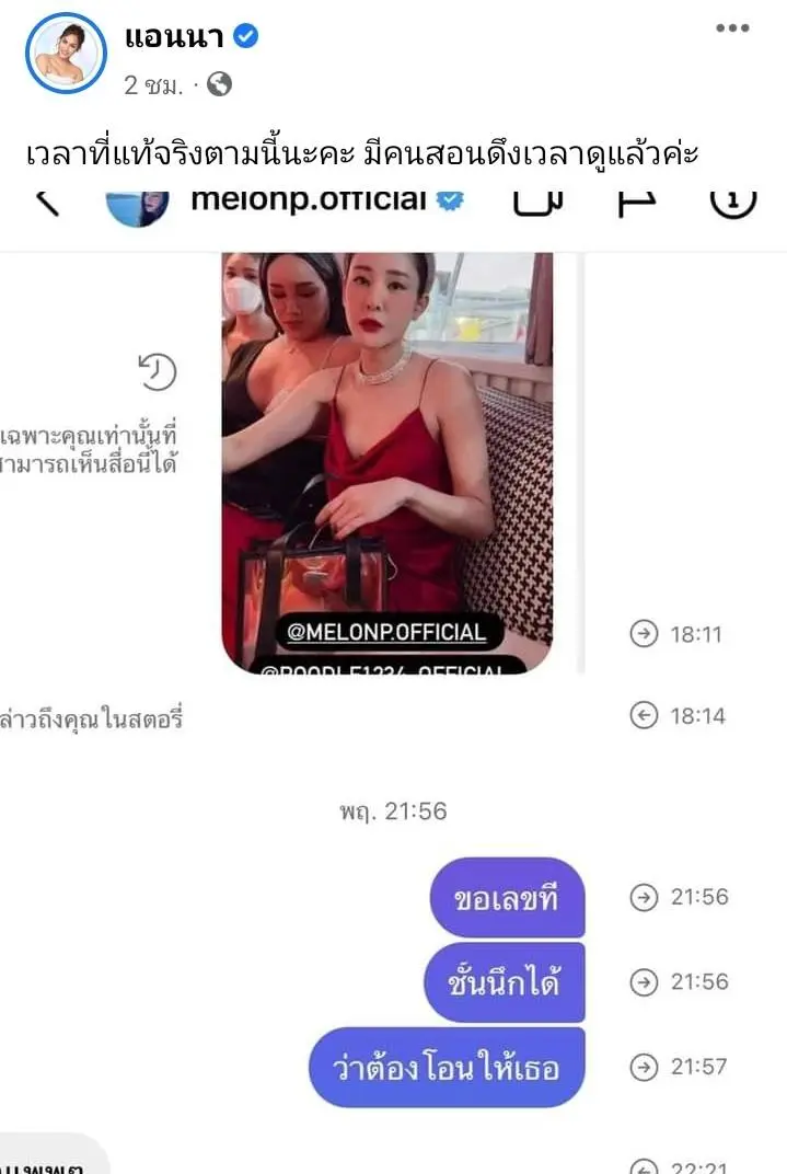 ขณะเดียวกันทางด้าน แฟนเพจ ทนายนิด้า ก็ได้โพสต์ภาพบทสนทนาของแอนนาที่มีการระบุหลักฐานเวลาเรียบร้อย พร้อมคำบรรยาย…