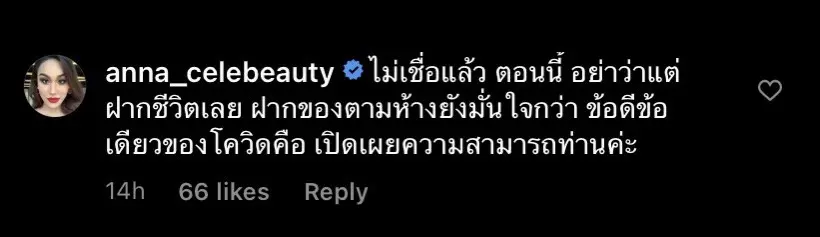 โดยเธอได้มีการโพสต์ข้อความว่า “ไม่เชื่อแล้วตอนนี้ อย่าว่าแต่ฝากชีวิตเลย ฝากของตามห้างยังมั่นใจกว่า ข้อดีข้อเดียวของโควิดคือเปิดเผยความสามารถท่านค่ะ” ทำเอาหลายๆคนต่างเห็นด้วยกับโพสต์ดังกล่าวกันอย่างมากมาย
