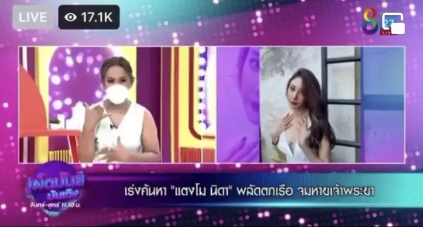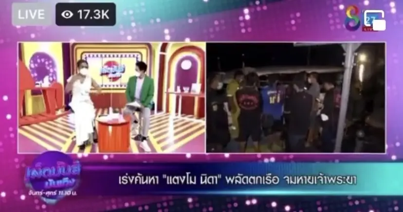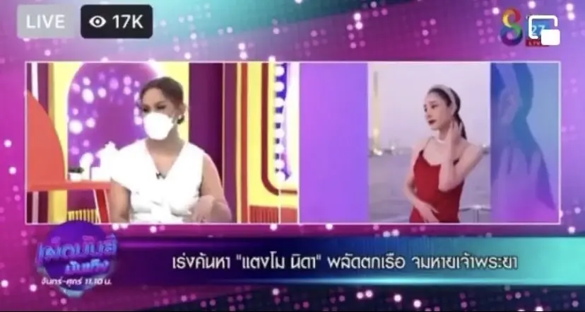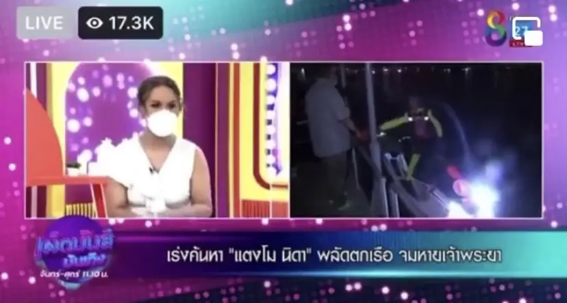 แตงโม นิดา — ยังคงเร่งตามหากันอย่างสุดความสามารถ หลังที่เจ้าหน้าที่นักประดาน้ำได้แจ้งเหตุการณ์ฉุกเฉินว่ามีคนพลัดตกจากเรือสปีดโบ๊ทกลางแม่น้ำเจ้าพระยา ช่วงสะพานพระราม7 สืบทราบภายหลังว่าคือ แตงโม นิดา นักแสดงชื่อดัง