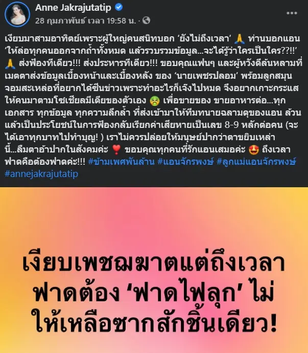 เอาล่ะสิค้าาา อยู่ดีๆก็เกิดไฟลุกลามทั่วเฟซบุ๊ก แอน จักรพงษ์ ขึ้นมา เมื่อจู่ๆ เจ้าตัวได้มีการออกมาโพสต์แบบเดือดขั้นสุด ด้วยข้อความว่า “เงียบเพชฌฆาตแต่ถึงเวลาฟาดต้อง ‘ฟาดไฟลุก’ ไม่ให้เหลือซากสักชิ้นเดียว!”