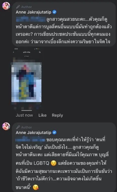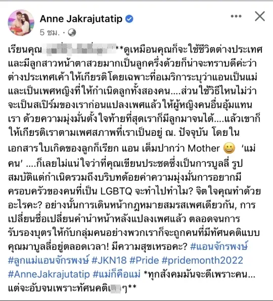 ซึ่งก็การเข้าตอบใต้คอมเมนต์ของชาวเน็ตรางนั้น พร้อมกับแคปเอาข้อความดังกล่าวมาโพสต์หน้าเฟซบุ๊กอีกครั้ง โดยบอกว่า ชาวเน็ตรายนี้ก็ดูจะใช้ชีวิตอยู่ที่ต่างประเทศ มีลูกสาวน่ารักที่เป็นลูกครึ่ง ก็น่าจะทราบดีกว่าที่ต่างประเทศเขาให้เกียรติโดยเฉพาะที่อเมริกา ระบุว่าแอนเป็นแม่และเป็นเพศหญิงที่ให้กำเนิดลูกทั้งสองคน แล้วเขาก็ให้เกียรติเราตามเพศสภาพที่เราเป็นอยู่ ณ ปัจจุบัน โดยในเอกสารใบเกิดของลูกก็เรียก แอน เต็มปากว่า Mother ก็เลยไม่แน่ใจว่าที่คุณเขียนประชดซึ่งเป็นการบูลลี่ รูปสมบัติแต่กำเนิด