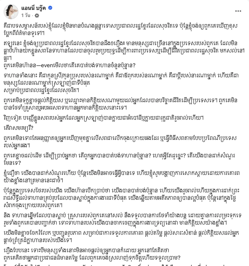 แอนนี่ บรู๊ค เคลื่อนไหว โพสต์สะท้อนใจทหารเขมรถูกลืม ผ่านโพสต์ 3 ภาษา