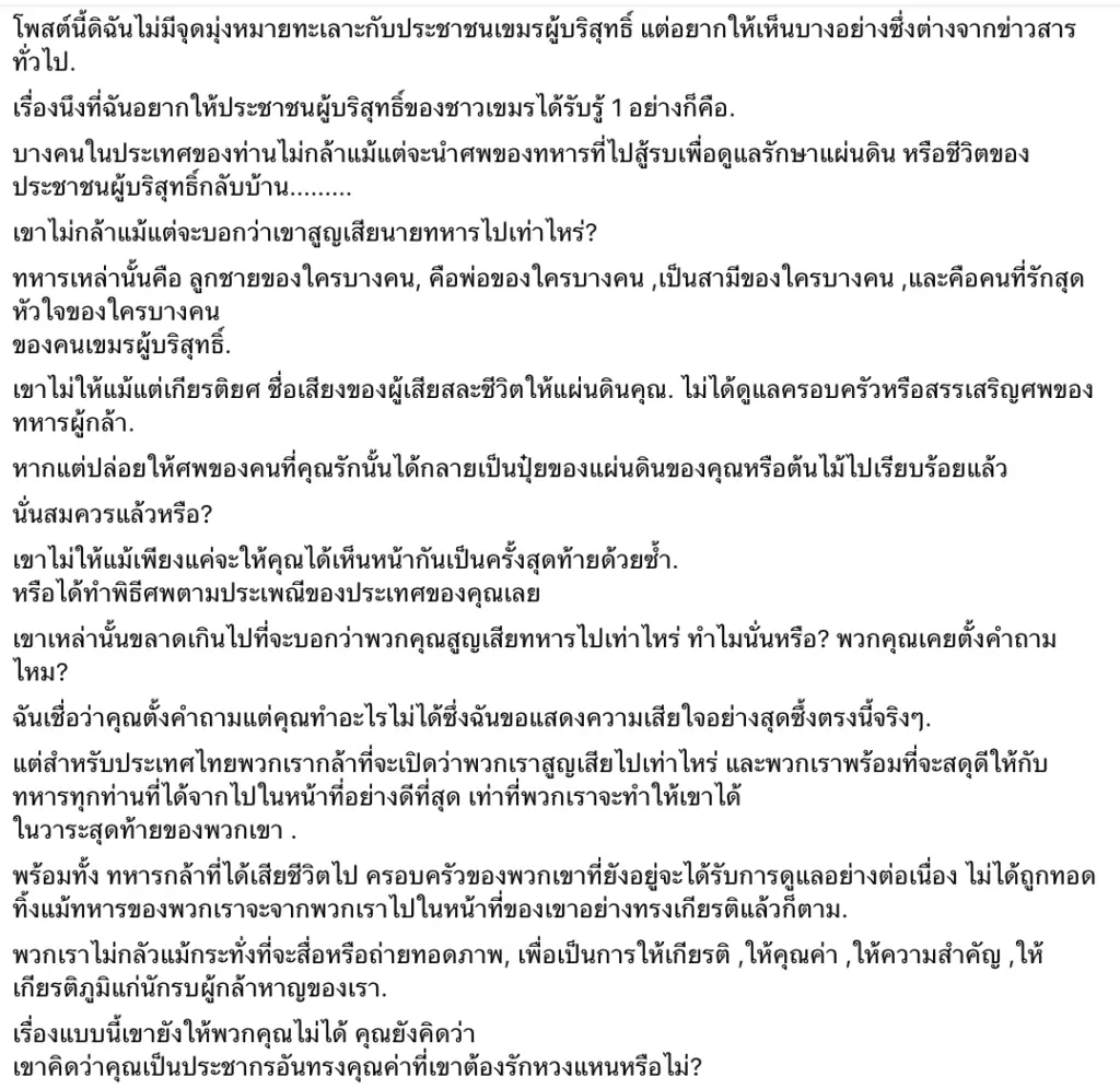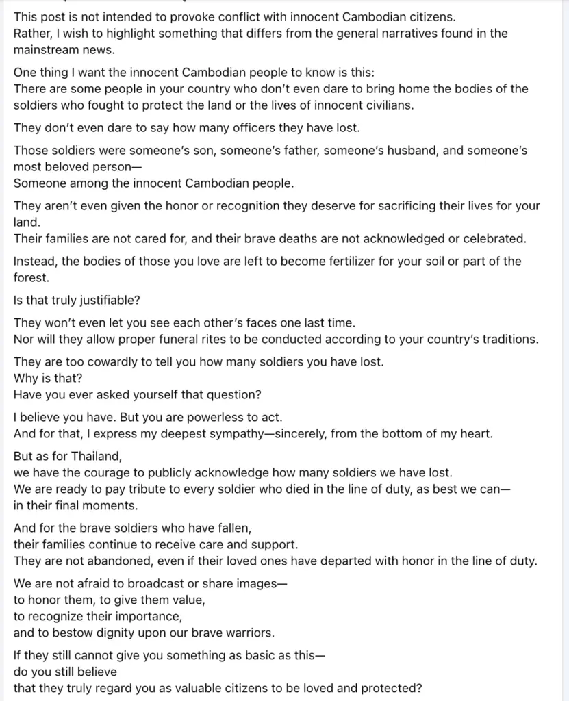 “ขอให้พี่น้องชาวกัมพูชาที่บริสุทธิ์ได้รับความยุติธรรมและปลอดภัย… ความขัดแย้งทางการเมืองไม่ควรทำให้ประชาชนต้องเดือดร้อน… เราเคยเป็นเพื่อนบ้านที่ดี และขอให้เป็นเช่นนั้นตลอดไป”