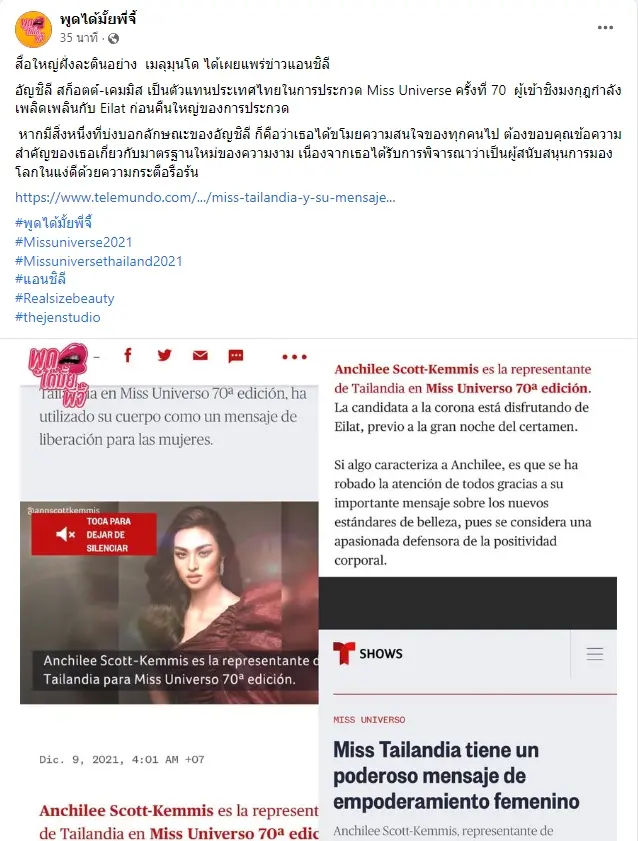 ทำเอาแฟนๆนางงาม ใจชื่นขึ้นมาหลายขุมเลยทีเดียว ที่ทางด้านสื่อยักษ์ใหญ่จากละตินอย่าง Telemundo ได้มีการลงข่าวเกี่ยวกับ แอนชิลี สก๊อต-เคมมิส ตัวแทนสาวงามจากประเทศไทย ในการประกวดเวที Miss Universe 2021 ที่กำลังจะเกิดขึ้นในอีกไม่กี่วันนี้