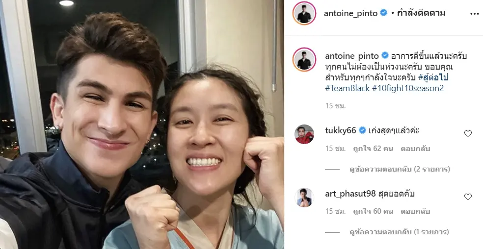 ล่าสุด อองตวน โค้ชของสาวเชียร์จากทีมสีดำ ได้มาลงอัพเดตอาการของดาราสาวลงในไอจีส่วนตัว โดยงานนี้มาพร้อมกับรูปคู่สาวเชียร์ยิ้มหวานสู้สุดใจ พร้อมแคปชั่นว่า “อาการดีขึ้นแล้วนะครับทุกคนไม่ต้องเป็นห่วงนะครับ ขอบคุณสำหรับทุกๆกำลังใจนะครับ #สู้ต่อไป #TeamBlack #10fight10season2”