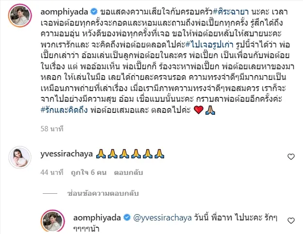 อ้อม พิยดา ยังฝากแสดงความเสียใจถึงครอบครัว ศิระฉายา ต่อการสูญเสียในครั้งนี้ เจ้าตัวเชื่อว่า เมื่อเรามีภาพความทรงจำดีๆพอสมควร เราก็จะจากไปอย่างมีความสุข