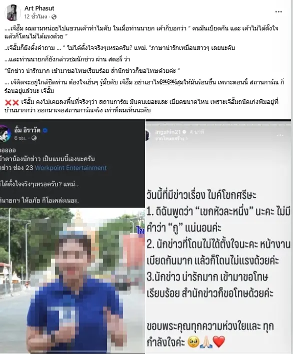 กลายเป็นประเด็นบนโลกออนไลน์ เมื่อ “อาร์ต พศุตม์ บานแย้ม” นักแสดงหนุ่มชื่อดัง ออกโรงเคลื่อนไหวผ่านเฟซบุ๊กส่วนตัว หลังเห็นโพสต์ของ “หมออั้ม อิราวัต” ที่ออกมาโพสต์ตำหนิ พร้อมเปิดหน้าผู้สื่อข่าวรายหนึ่ง ซึ่งเกิดเหตุไมค์ไปโดนศีรษะของ น.ส.แพทองธาร ชินวัตร นายกรัฐมนตรี ระหว่างลงพื้นที่ จ.อุบลราชธานี