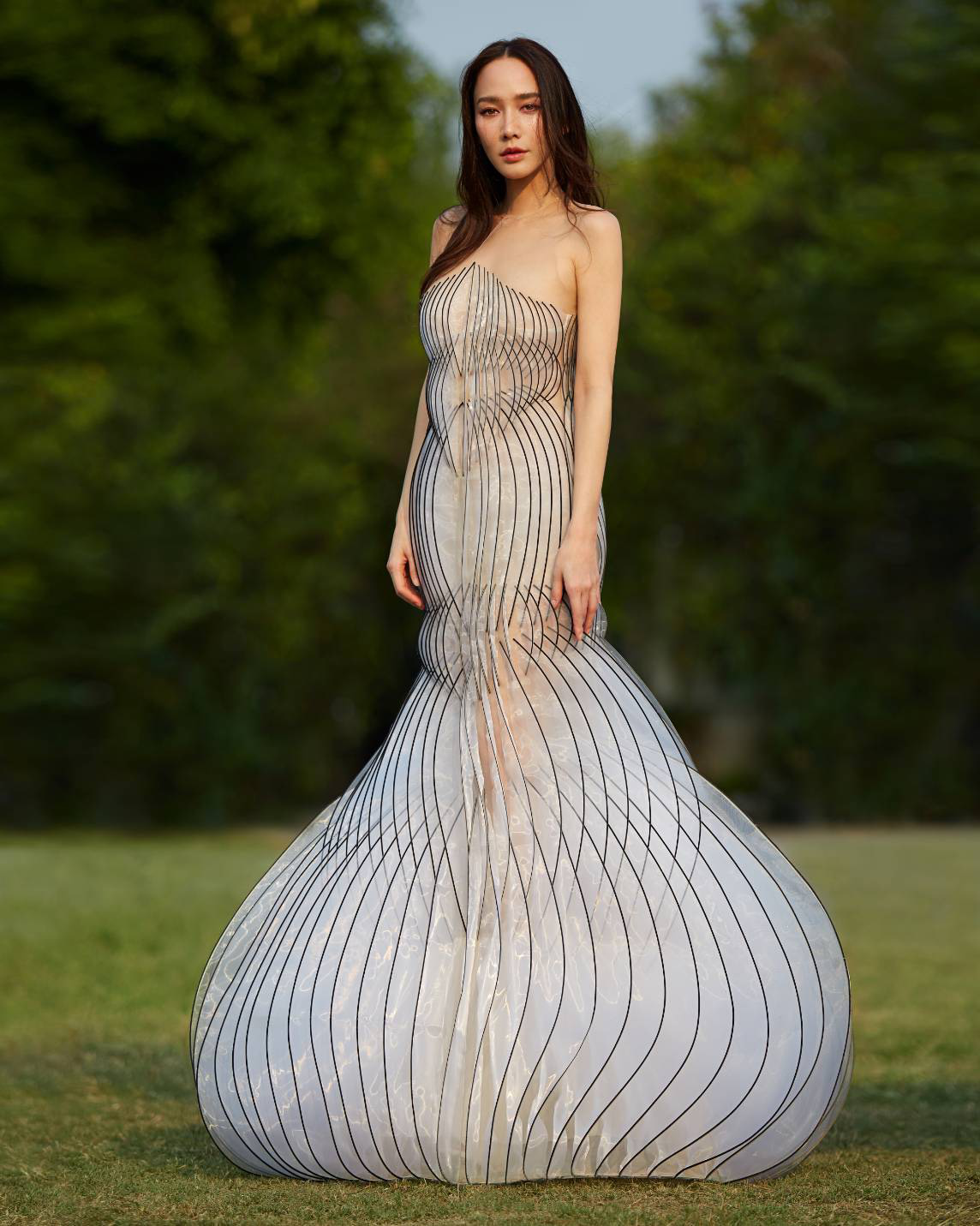 สำหรับชุดที่ “อั้ม พัชราภา” สวมใส่ ต้องใช้คำว่ามิธรรมดา เพราะนอกจากเป็นแบรนด์โอตกูตูร์จากห้องเสื้อ iris van Herpen ชุดนี้ยังใช้การผลิตที่แสนพิถีพิถัน ผนวกกับการใช้เทคนิคแบบพิเศษขั้นสูง 3D printing และ laser cut ในการทำชุด ที่กินเวลามากกว่าหลายเดือนในการผลิตต่อ 1 ชุด ซึ่งล้วนแล้วเป็นที่มาของการกำเนิดชุดโอตกูตูร์
