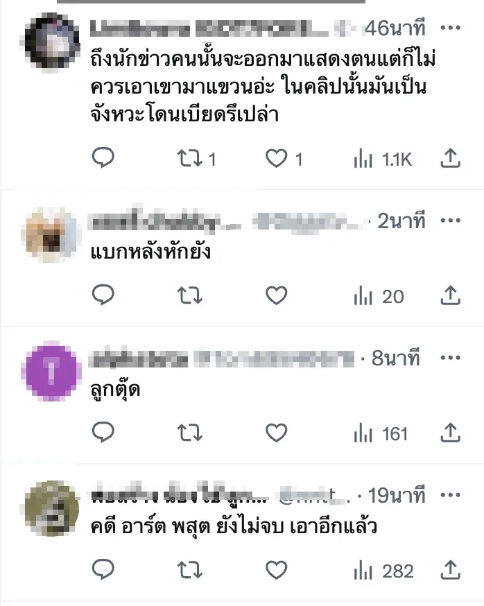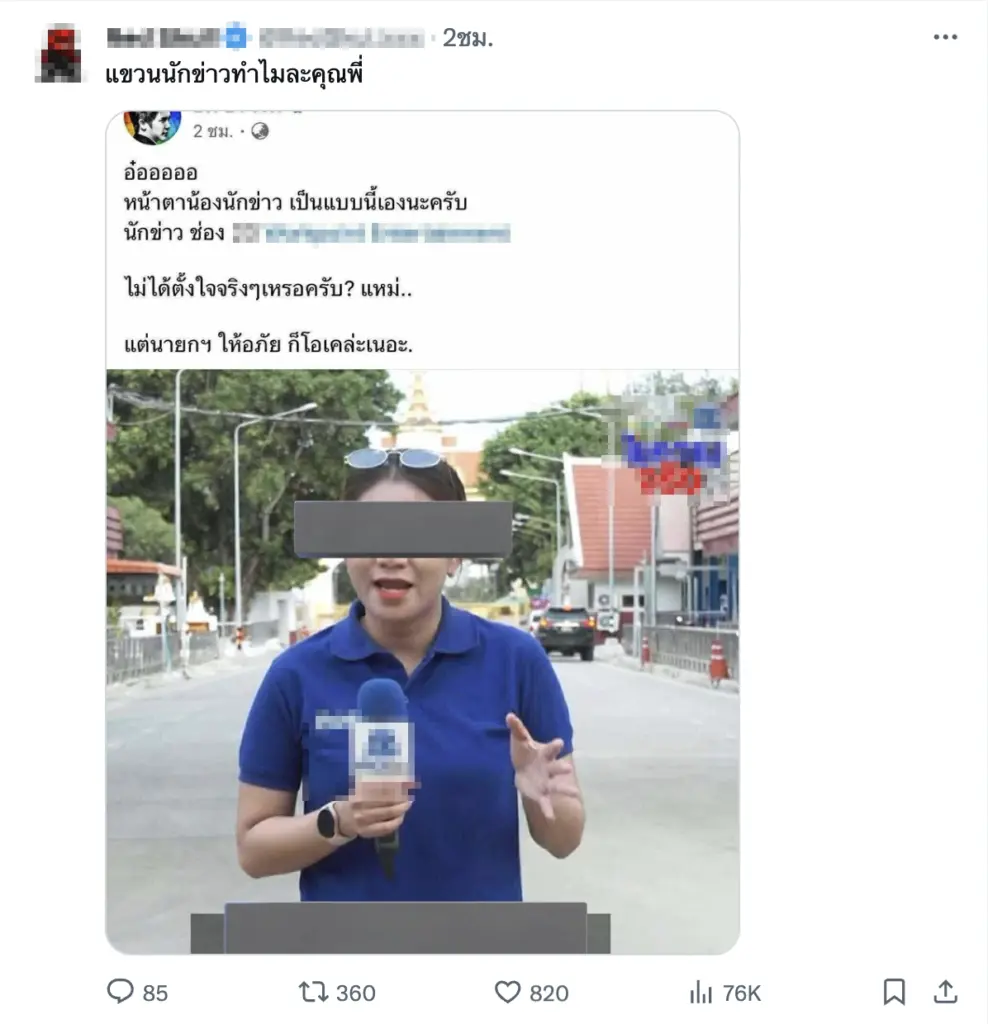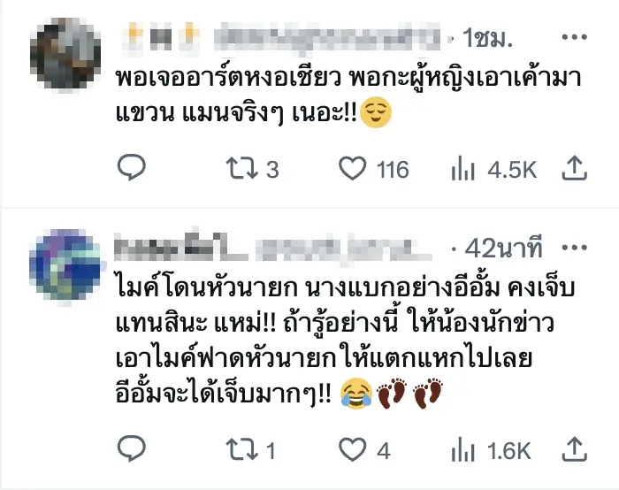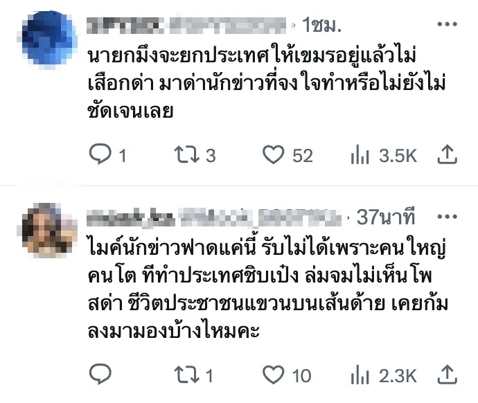 - “ไมค์นักข่าวฟาดแค่นี้ รับไม่ได้เพราะคนใหญ่คนโต ทีทำประเทศล่มจมไม่เห็นโพสด่า!”