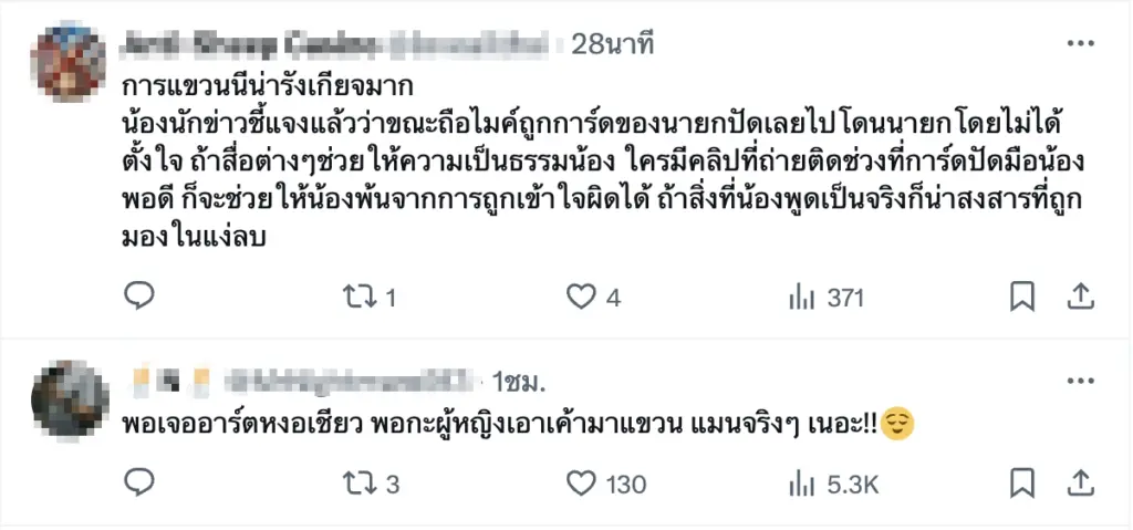 - “การแขวะนิน่ารังเกียจมาก นักข่าวก็ชี้แจงแล้วว่าโดนการ์ดปัดมือ ไมค์เลยไปโดนโดยไม่ได้ตั้งใจ”