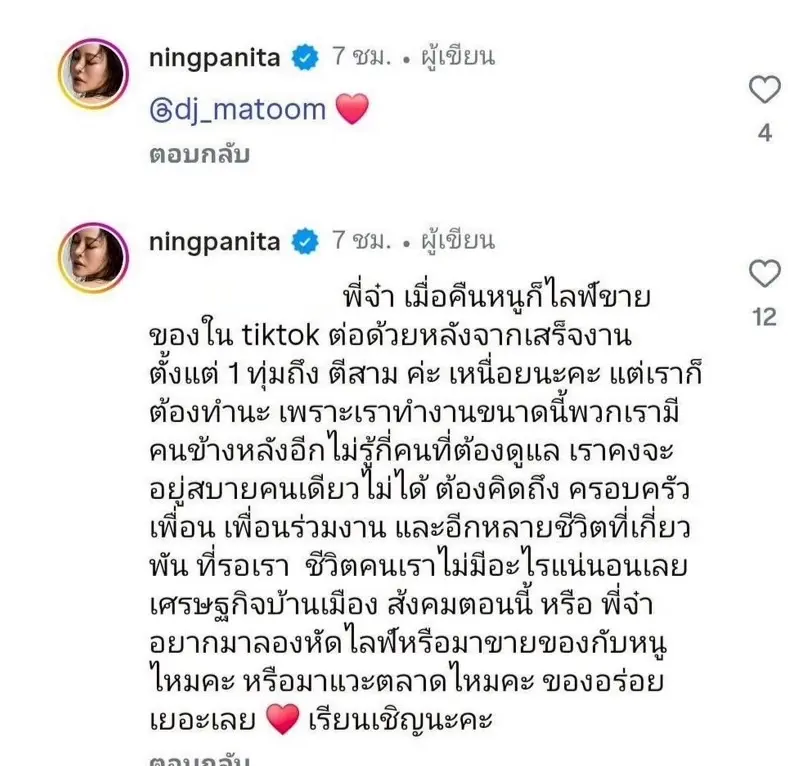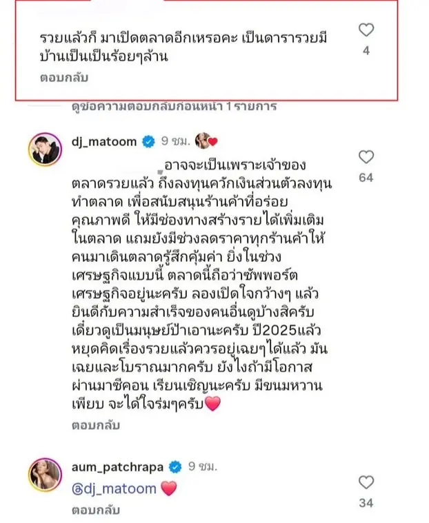 นอกจากนี้ ดีเจมะตูมยังทิ้งท้ายเชิญชวนอย่างสุภาพว่า หากมีโอกาสก็ขอให้แวะมาเดินตลาด พร้อมรับรองว่าของกินอร่อยเพียบ และอาจช่วยให้ “ใจร่ม ๆ” มากขึ้นอีกด้วย โดยมีสาวอั้มเข้ามาคอมเมนต์รูปหัวใจตอบกลับให้กำลังใจมะตูมด้วยความขอบคุณ