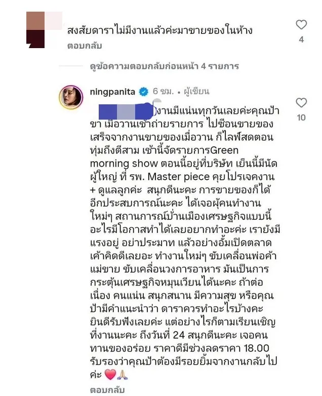 “งานมีแน่นทุกวันเลยค่ะคุณป้าขา… เมื่อวานเช้าถ่ายรายการ กลางวันขายของ เย็นไลฟ์สดถึงตีสาม เช้ามาจัดรายการต่อ เย็นมีนัดโปรเจกต์งานและดูแลลูก”