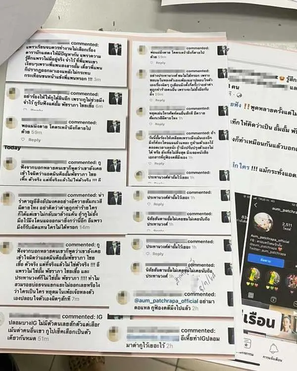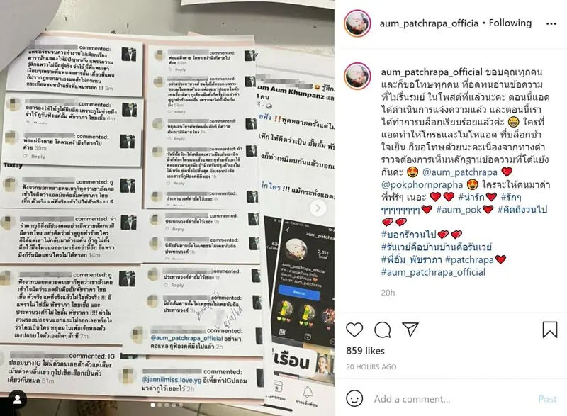 ต่อมาเกรียนคนดังกล่าวก็เข้ามาคอมเมนต์ป่วนหลายข้อความ จนดันคอมเมนต์ของแฟนคลับคนอื่น ๆ ลงไปหมด งานนี้ อั้ม พัชราภา ขอไม่ทน มีการคอมเมนต์ถึงแอดมินว่า “แอดบล็อกหรือแคปเก็บไว้เป็นหลักฐานนะคะ พี่ไม่เห็นข้อความเขาเพราะพี่บล็อกไปแล้วค่ะ @aum_patchrapa_official” ซึ่งต่อมาแอดมินก็แคปหลักฐานเก็บไว้ และเดินทางไปแจ้งความกับเจ้าหน้าที่ตำรวจเรียบร้อยแล้ว