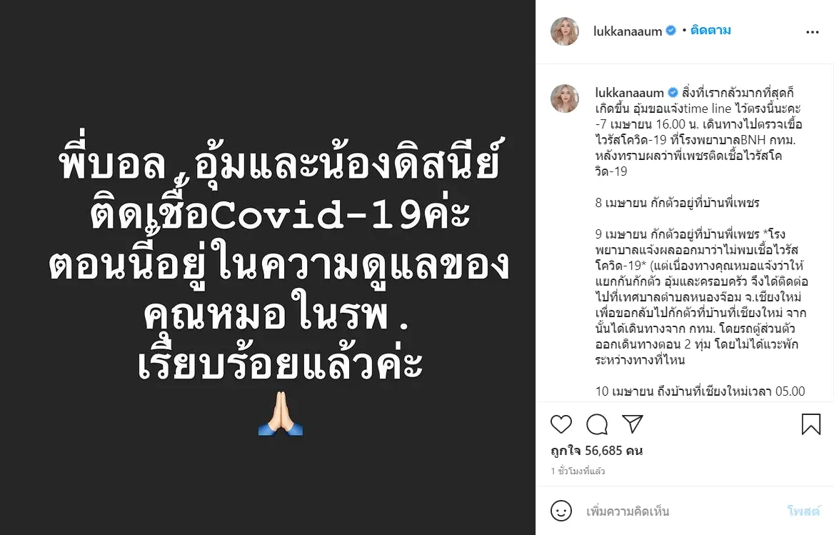 เรียกได้ว่าสร้างความตกใจเป็นอย่างหนักเมื่อคุณแม่คนสวย อุ้ม ลักขณา ได้ออกมาประกาศว่าติดเชื้อโควิด-19 ยังไม่พอ สามี บอล กฤษณะ และ ลูกสาว น้องดิสนีย์ ก็ยังติดเชื้อโควิด-19 ด้วยอีกเช่นกัน และก่อนหน้านี้ น้องสาวอย่าง นิวเคลียร์ละดีเจเพชรจ้า ก็ได้ติดเชื้อโควิด-19 และเข้ารับการรักษาแล้วเรียบร้อย ซึ่งอุ้มได้แจงไทมไลน์เอาไว้ดังนี้