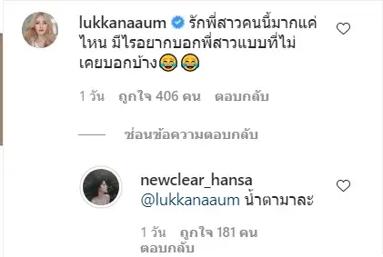 ล่าสุดด้านพี่สาวคุณแม่ลูก1 หุ่นแซ่บ อุ้ม ลักขณา ก็ได้เข้าไปคอมเมนต์โพสต์ของน้องสาวเช่นกันว่า “รักพี่สาวคนนี้มากแค่ไหน มีไรอยากบอกพี่สาวแบบที่ไม่เคยบอกบ้าง”ด้านนิวเคลียร์เองก็ได้เข้ามาตอบว่า “น้ำตามาละ”