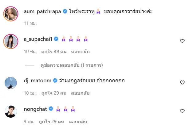 โดยงานนี้จัดเต็มชุดเครื่องไหว้ พร้อมดึงหมอดังอย่าง หมอช้าง มาทำพิธีให้ด้วย โดยเธอได้อัปรูปลงอินสตราแกรมพร้อมข้อความว่า ไหว้พระราหู🙏🏻 ขอบคุณอาจาร์ยช้างค่ะ ท่ามกลางแฟนๆที่เข้ามาร่วมอวยพรให้เฮง ๆ ปัง ๆอย่างมากมาย รวมถึงผู้จัดการอย่างพี่เอ ศุภชัย ก็เข้ามาคอมเมนต์อิโมจิรูปไหว้อีกด้วย