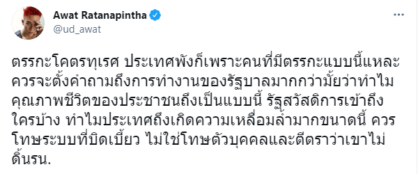 ก่อนจะมีผู้ใช้ทวิตเตอร์รายหนึ่ง ได้นำคอมเมนท์ดังกล่าวมาโพสต์และแสดงความเห็นว่า “ขอโทษที่ยายเกิดมาจนครับ #น้าค่อม” ซึ่งอวัช เมื่อเห็นทวิตนี้แล้ว ก็ได้วิพากษ์วิจารณ์เจ้าของคอมเมนท์ในเฟซบุ๊ค ว่า “ตรรกะโคตรทุเรศ ประเทศพังก็เพราะคนที่มีตรรกะแบบนี้แหละ ควรจะตั้งคำถามถึงการทำงานของรัฐบาลมากกว่ามั้ยว่าทำไมคุณภาพชีวิตของประชาชนถึงเป็นแบบนี้ รัฐสวัสดิการเข้าถึงใครบ้าง ทำไมประเทศถึงเกิดความเหลื่อมล้ำมากขนาดนี้ ควรโทษระบบที่บิดเบี้ยว ไม่ใช่โทษตัวบุคคลและตีตราว่าเขาไม่ดิ้นรน”