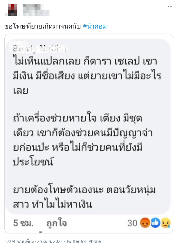 ดังกล่าว ได้มีคอมเมนท์ผุดวิจารณ์ในเฟซบุ๊ค ว่า “ไม่เห็นแปลกเลย ก็ดารา เซเลป เขามีเงิน มีชื่อเสียง แต่ยายเขาไม่มีอะไรเลย ถ้าเครื่องช่วยหายใจ เตียง มีชุดเดยว เขาก็ต้องช่วยคนมีปัญญาจ่ายก่อนป่ะ หรือไม่ก็ช่วยคนที่ยังไม่ประโยชน์ ยายต้องโทษตัวเองนะ ตอนวัยหนุ่มสาว ทำไมไม่หาเงิน”