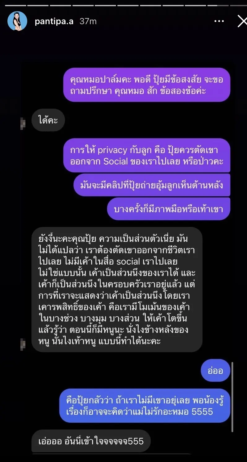 ล่าสุด ปุ้มปุ้ย ได้มีการแคปข้อความแชทที่ได้มีการปรึกษาคุณหมอในเรื่องของการปกป้องสิทธิเด็กว่า การให้ privacy กับลูก คือ ปุ้ยควรตัดเขาออกจาก Social ของเราไปเลย หรือเปล่าคะ มันจะมีคลิปที่ปุ้ยถ่ายอุ้มลูกเห็นด้านหลัง บางครั้งก็มีภาพมือหรือเท้าเขา