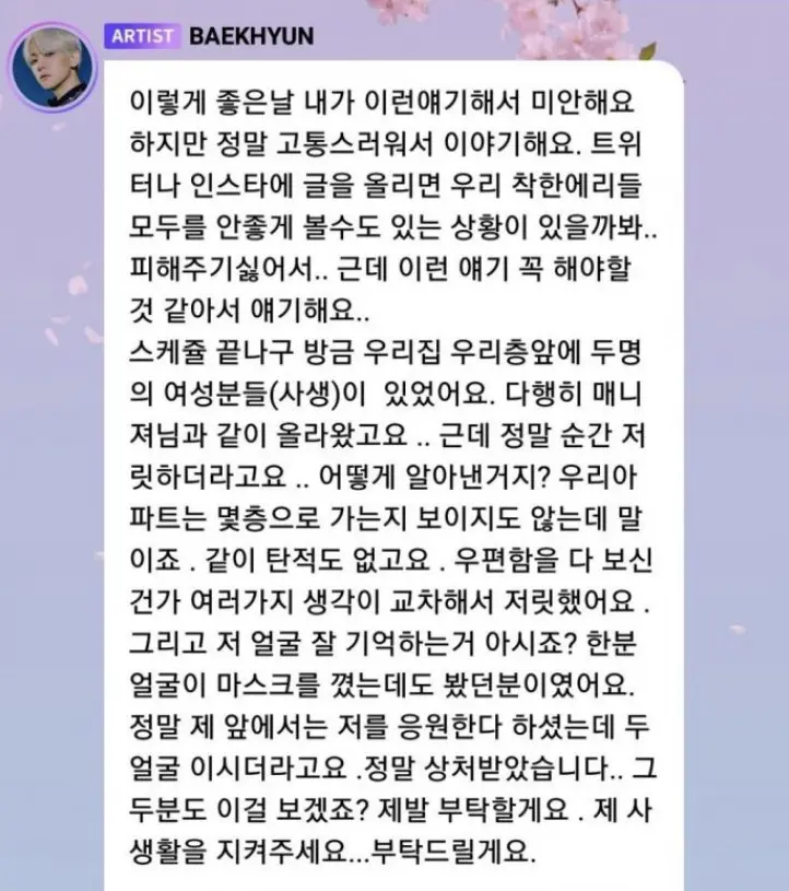 นอกจากนี้ แบคฮยอน ยังเผยถึงซาแซงที่รออยู่หน้าอพาร์ตเมนต์ของเขา ผ่านข้อความใน Lysn อีกด้วยว่า “ผมรู้สึกเสียใจจริงๆ ที่ต้องพูดเรื่องนี้ในวันที่ดีแบบนี้ ผมเป็นกังวลว่าเหตุการณ์ที่เกิดขึ้นจะสร้างภาพลักษณ์ที่ไม่ดีให้กับเอลี่ของเรา เมื่อพวกเขาได้โพสต์ผ่านอินสตาแกรมหรือทวิตเตอร์ก็ตามผมไม่ต้องการให้มีผลเสียต่อใคร แต่รู้สึกว่าผมต้องพูดเรื่องนี้อย่างจริงจัง ผมเจอซาแซงแฟนผู้หญิง 2 คนอยู่หน้าที่พักหลังจากที่ผมเสร็จจากตารางงานและกลับมาที่บ้าน โชคดีมากที่ตอนนั้นผมอยู่กับเมเนเจอร์แต่ตอนนี้ผมรู้สึกกลัวมาก พวกเขารู้ได้ยังไงไม่มีใครที่จะรู้การเข้าออกภายในอพาร์ตเมนท์ได้ และเราไม่เคยขึ้นลิฟท์เดียวกันพวกเขาดูจากกล่องจดหมายหรือเปล่า หลายความคิดมากมายที่เข้ามาในหัวของผมมันทำให้ผมกังวลมาก แล้วรู้หรือเปล่าว่าผมน่ะจำหน้าได้อย่างดีเลยนะ คนนึงใส่หน้ากากแต่เป็นคนที่ผมเคยเห็นมาก่อน พวกเขาบอกว่าสนับสนุนผม แต่พวกเขาตีสองหน้า ผมรู้สึกเจ็บปวดมาก พวกเขาจะได้เห็นข้อความนี้ไหม แต่ได้โปรดช่วยรักษาความเป็นส่วนตัวด้วย ขอร้องนะครับ”