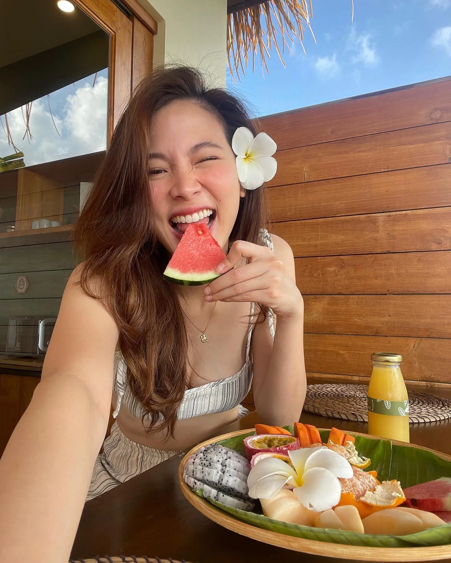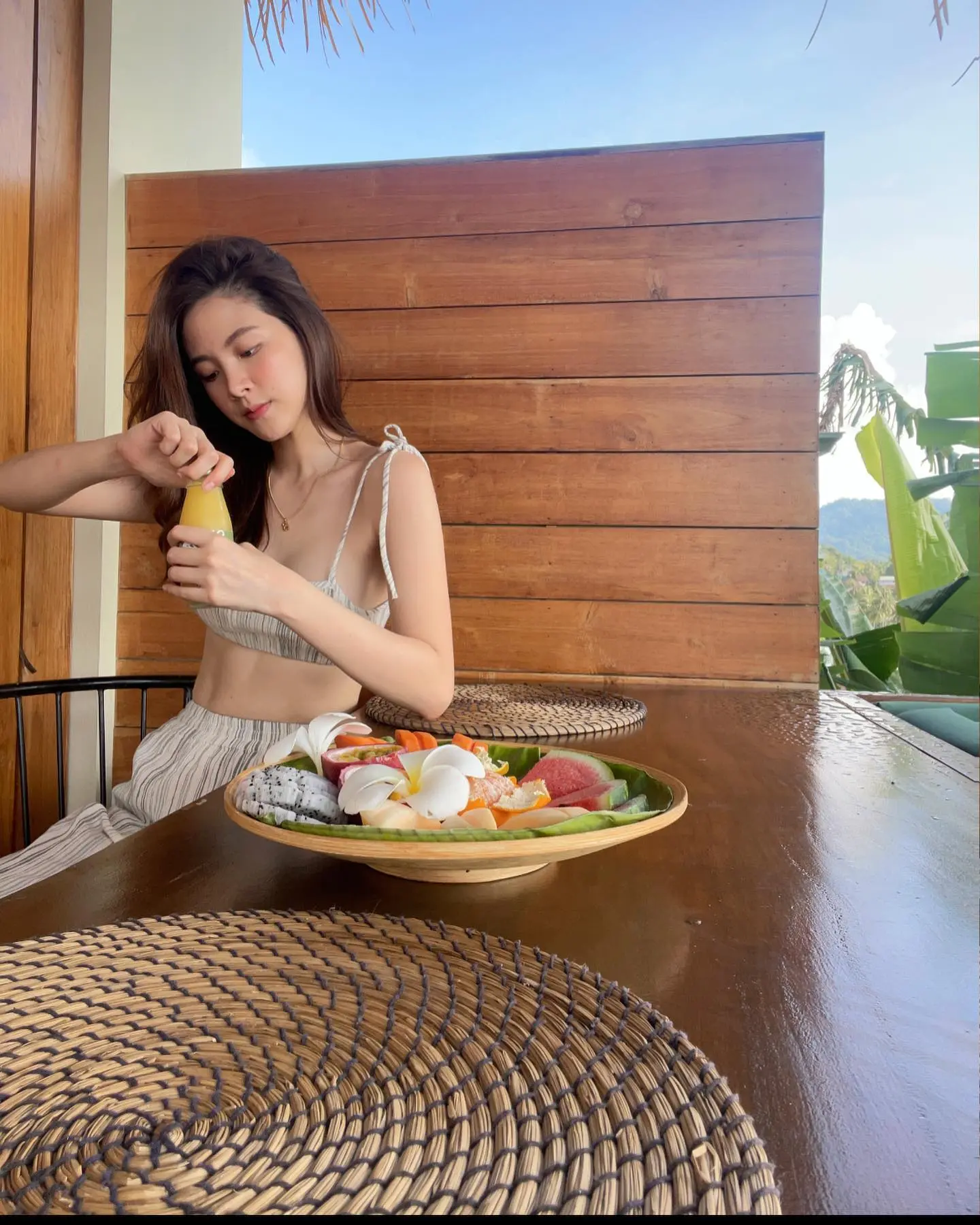ซึ่งเซ็ตภาพดังกล่าวนั้น เธอได้มีการออกไปเที่ยวทริปสูดบรรยากาศกันแบบพักผ่อนอย่างเต็มที่ พร้อมแชะภาพกับน้องช้างกันแบบแย่งซีนกันไม่ลงเลยทีเดียว แต่ภาพที่ทำเอาแย่งซีนไปทั้งหมดทั้งมวลนั้นคงจะไม่พ้นกับชุดสายเดี่ยว ที่เธอได้หยิบยกมาสวมกันในทริปนี้