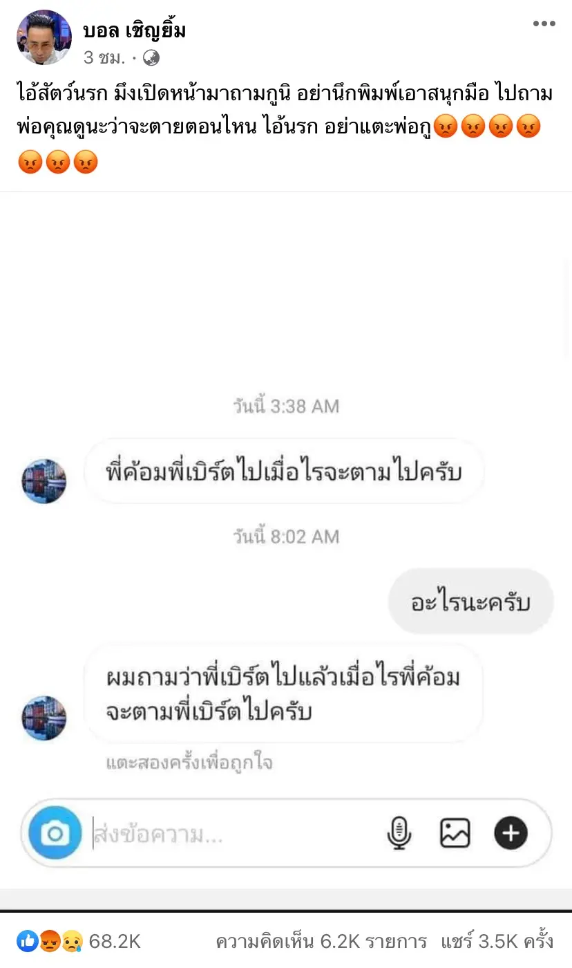 ทำเอา บอล เชิญยิ้ม เดือดเลยจริงๆเพราะว่ามีมือดีเข้ามาทักเจ้าตัวว่า “เมื่อไหร่ น้าค่อม จะตาม โรเบิร์ต สายควัน ไป” ซึ่งงานนี้ด้าน บอล เชิญยิ้ม ได้เเคปเเชทข้อความดังกล่าวลงในเฟซบุ๊กส่วนตัว จวกยับเหตุไม่ให้เกียรติน้าค่อม โดยเจ้าตัวได้โพสต์ข้อความว่า “ไอ้สัตว์นรก มึ*เปิดหน้ามาถามก*นิ อย่านึกพิมพ์เอาสนุกมือ ไปถามพ่อคุณดูนะว่าจะตายตอนไหน ไอ้นรก อย่าแตะพ่อก*”
