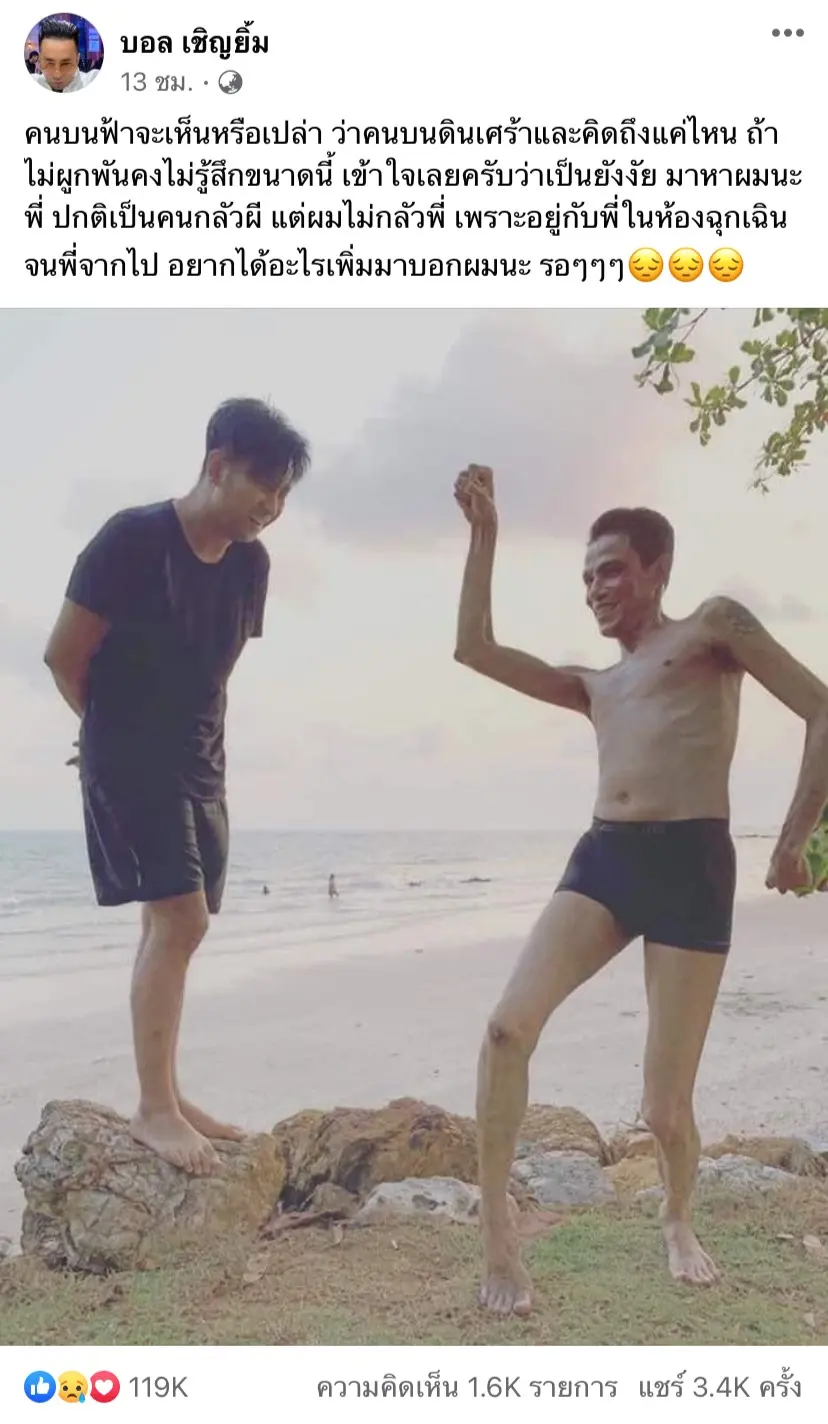 ล่าสุด บอล เชิญยิ้ม เผยภาพคู่ โรเบิร์ต พร้อมข้อความสุดประทับใจว่า “คนบนฟ้าจะเห็นหรือเปล่า ว่าคนบนดินเศร้าและคิดถึงแค่ไหน ถ้าไม่ผูกพันคงไม่รู้สึกขนาดนี้ เข้าใจเลยครับว่าเป็นยังงัย มาหาผมนะพี่ ปกติเป็นคนกลัวผี แต่ผมไม่กลัวพี่ เพราะอยู่กับพี่ในห้องฉุกเฉินจนพี่จากไป อยากได้อะไรเพิ่มมาบอกผมนะ รอๆๆๆ???”