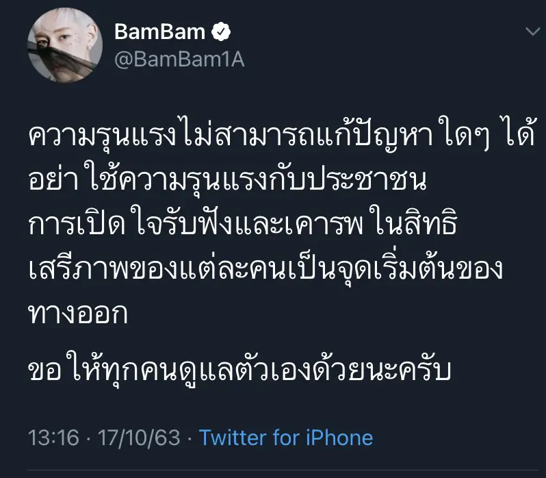 ล่าสุด 17 ตค. 63 ไอดอลเกาหลีสัญชาติไทยอย่าง แบมแบม GOT7 ออกมาโพสต์ข้อความผ่านทวิตเตอร์ส่วนตัวว่า “ความรุนแรงไม่สามารถแก้ปัญหาใดๆ ได้ อย่าใช้ความรุนแรงกับประชาชน การเปิดใจรับฟังและเคารพในสิทธิเสรีภาพของแต่ละคนเป็นจุดเริ่มต้นของทางออก ขอให้ทุกคนดูแลตัวเองด้วยนะครับ” เรียกได้ว่า ถือเป็นอีกหนึ่งบุคคลบันเทิง ที่ออกมาสนับสนุนห้ามใช้ความรุนเเรง