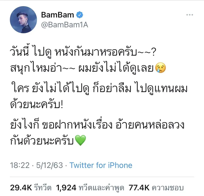 แบมแบม Got 7 หลังจากที่ภาพยนตร์ชื่อดังอย่าง อ้ายคนหล่อลวง ได้เข้าฉายในโรงภาพยนตร์เมื่อวันที่ 5 ธันวาคมที่ผ่าน ซึ่งบอกได้เลยว่าเพลงที่ไอดอลเกาหลีอย่าง แบมแบม Got 7 ที่มาร่วมร้องเพลงประกอบให้นั้นก็ปังไม่แพ้กัน