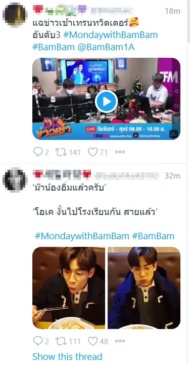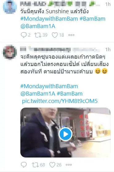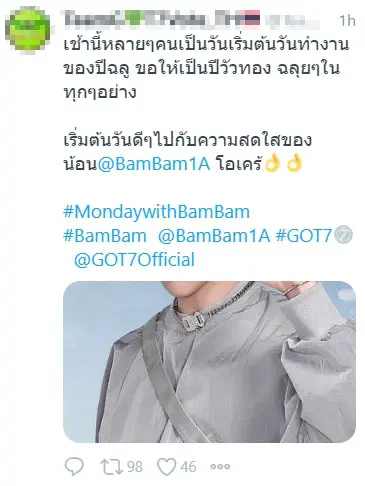 เหล่าอากาเซ่พาน้อง แบมแบม GOT7 มาแจกแต่ต้นอาทิตย์เลยทีเดียว เรียกได้ว่ามาเป็นวิตามินรายวันให้กับเหล่าชาวด้อมได้พร้อมมีพลังต่อสู้กับวันจันทร์ โดยได้พาสร้างแฮชแท็ก #MondaywithBamBam พร้อมกับดันแท็กจนติดเทรนด์อันดับ 1 ทวิตเตอร์ประเทศไทยไปแล้วเรียบร้อย