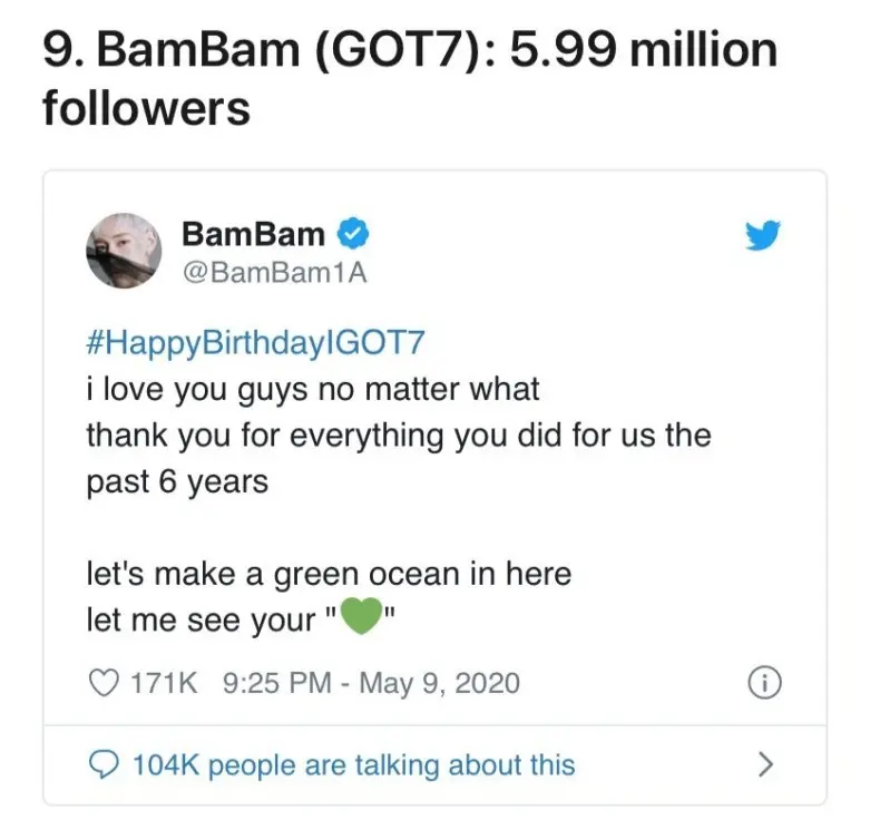 ก่อนหน้านี้ แบมแบม GOT7 ถูกจัดอยู่ในลำดับท็อป 9 ใน 25 K-Pop ที่มียอดผู้ติดตามมากที่สุด โดยมียอดผู้ติดผู้ติดตามถึง 5.99 ล้านคน