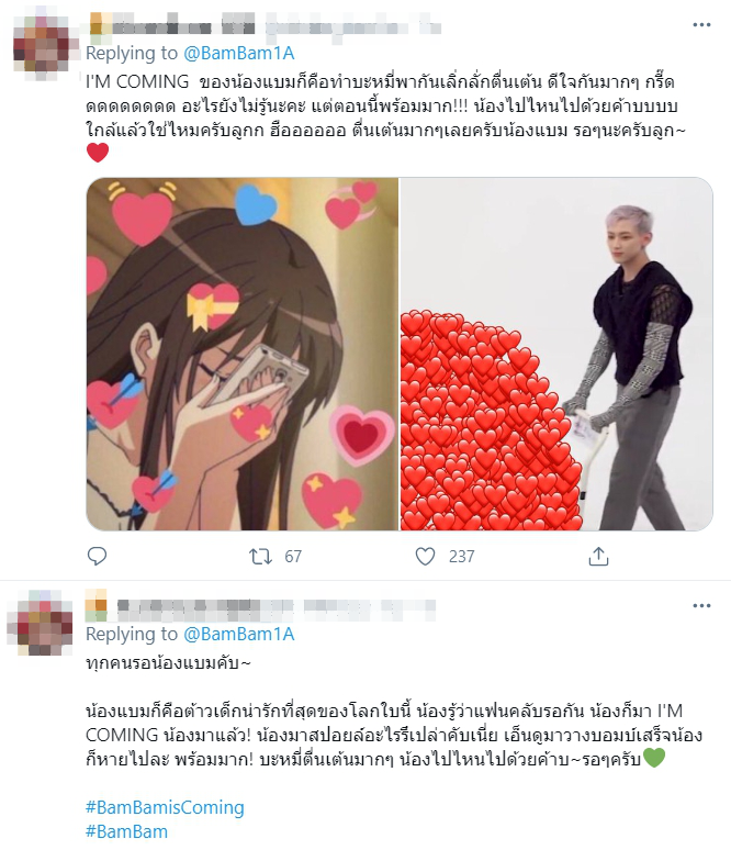 ซึ่งงานนี้ทำเอาแฟนคลับทั้งพากันตื่นเต้นและสงสัยกันเป็นแถว ว่าแบมแบมหมายความว่าอะไรกันแน่ ทั้งยังพากันติดแฮชแท็ก #BamBamisComing จนโผติดที่ 1 เทรนด์ทวิตเตอร์ประเทศไทยกันเลยทีเดียว