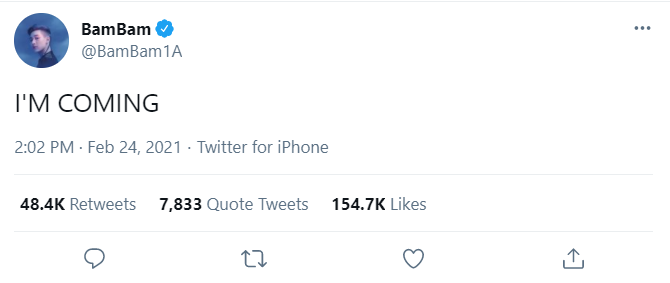 โดยแบมแบม ได้ออกมาทวิตเมื่อวันที่ 24 ก.พ. เวลา 2.02 น. ว่า