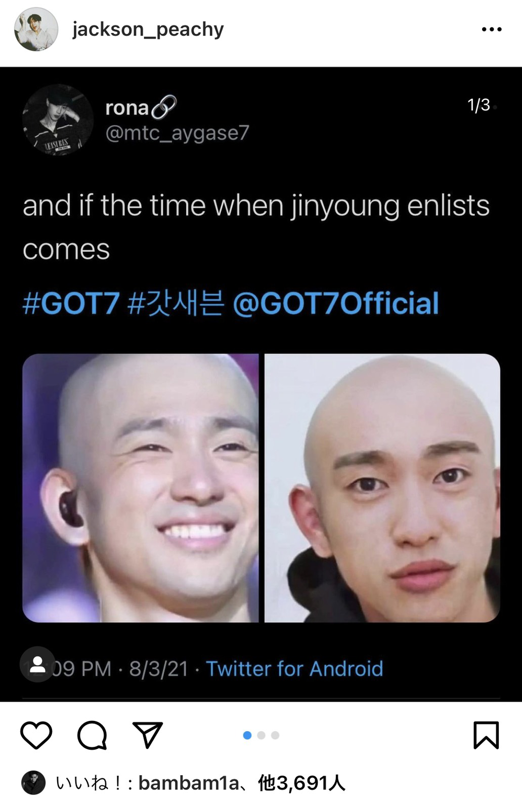 ล่าสุดก็มีชาวเน็ตตาดีได้ผ่านไปเห็นว่าหนุ่มแบมแบมกดถูกใจโพสต์โพสต์หนึ่งทางอินสตาแกรม เป็นภาพของหนุ่มจินยองที่แฟนคลับได้ตัดต่อขึ้น โดยจินตนาการว่าหากวันที่หนุ่มจินยองเข้ากรมมาถึงจะเป็นอย่างไร