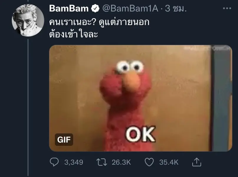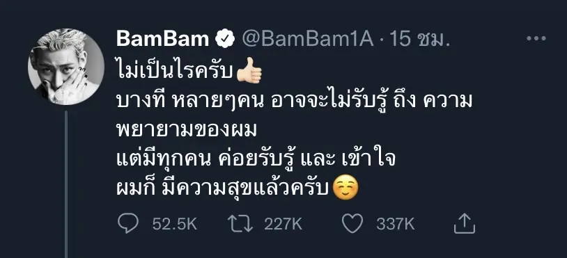 ล่าสุด แบมแบม GOT7 ได้มีการออกมาโพสต์ข้อความผ่านทางทวิตเตอร์ เคลื่อนไหวต่อกรณีดังกล่าวว่า ไม่เป็นไรครับ บางทีหลายๆคน อาจจะไม่รับรู้ ถึงความพยายามของผม แต่มีทุกคน คอยรับรู้ และ เข้าใจ ผมก็มีความสุขแล้วครับ ตามมาติดๆกับมีมที่มีข้อความคำว่า OK พร้อมระบุข้อความต่ออีกว่า คนเราเนอะ? ดูแค่ภายนอก ต้องเข้าใจละ