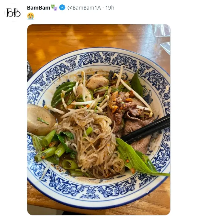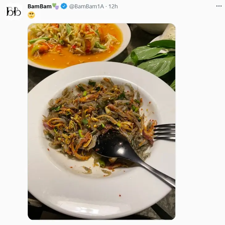 ซึ่งหลังจากที่ แบมแบม ได้กลับมาบ้านเกิดที่ประเทศไทยแล้ว พลาดไม่ได้นั่นก็คืออาหารจานเด็ด จานแรกของ แบมแบม อย่าง ก๋วยเตี๋ยวเรือ ตามมาติดๆก็คือเมนู ส้มตำ ยำกุ้งเต้น ซึ่งเจ้าตัวก็ได้มีการอัปเดตภาพผ่านทางทวิตเตอร์ พร้อมระบุอิโมจิรูปร้องไห้ บอกเลยว่าทำเอาบรรดาแฟนๆนั้นต่างเอ็นดูในความน่ารักนี้กันเป็นจำนวนมาก