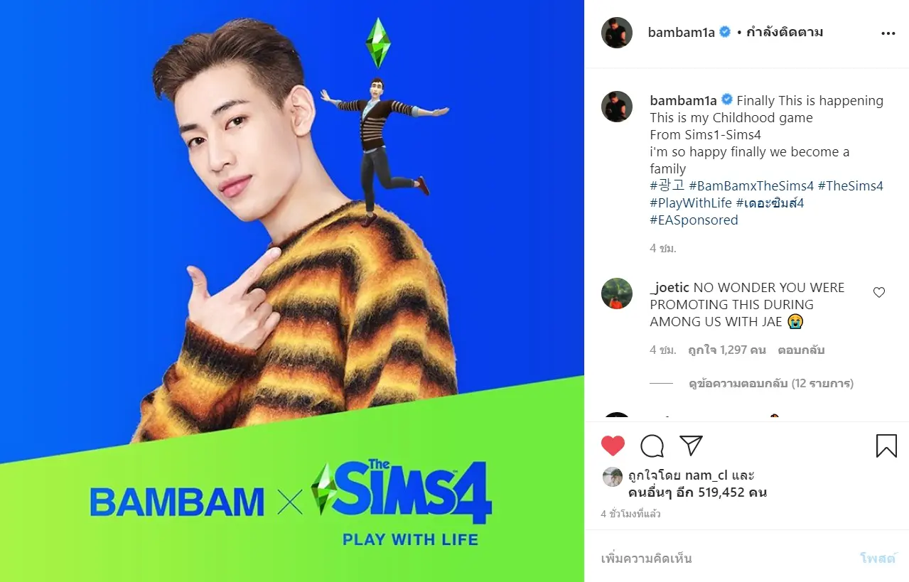 ซึ่งการร่วมงานในครั้งนี้หนุ่มแบมแบมเผยความรู้สึกว่าดีใจมากๆ เพราะส่วนตัวก็เป็นแฟนพันธุ์แท้ของเกม The Sims ชอบเล่นมาตั้งแต่เด็กแล้ว ชอบสร้างบ้าน ตกแต่งบ้าน แถมภาคนี้ยังมีฟีเจอร์ใหม่ๆ ให้ได้เล่นกันหลากหลาย ไม่ว่าจะเป็นการสร้างตัวละครให้มีมิติที่ลึกขึ้น หรือการจำลองวัฒนธรรมต่างๆ ทั่วโลกเข้ามาในเกมเพื่อช่วยเพิ่มอรรถรสและความสมจริงให้กับผู้เล่นมากขึ้นไปอีก