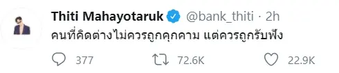 เป็นอีกหนึ่งคนบันเทิงที่ออกมาเเสดงจุดยืนสำหรับ แบงค์ ธิติ นักแสดงชื่อดังที่ล่าสุดขอเป็นตัวแทนเด็กรุ่นใหม่ เรียกร้องประชาธิปไตย พร้อมเผยข้อความผ่านอินสตาแกรมว่า “คนที่คิดต่างไม่ควรถูกคุกคาม แต่ควรถูกรับฟัง”