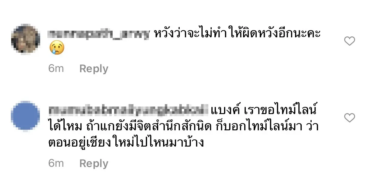 อย่างไรก็ตาม ชาวเน็ตยังคงไม่พอใจกับการเปิดเผยไทม์ไลน์ของแบงค์ ซึ่งยังคงมีหลายๆคนที่อยากทราบไทม์ไลน์อย่างละเอียดถี่ถ้วนของแบงค์ ขณะอยู่ที่จังหวัดเชียงใหม่ จึงได้มีการเข้าไปคอมเมนต์ถามแบงค์ว่า “แบงค์ เราขอไทม์ไลน์ได้ไหม ถ้าแกยังมีจิตสำนึกสักนิด ก็บอกไทม์ไลน์มาว่าตอนอยู่เชียงใหม่ไปไหนมาบ้าง”