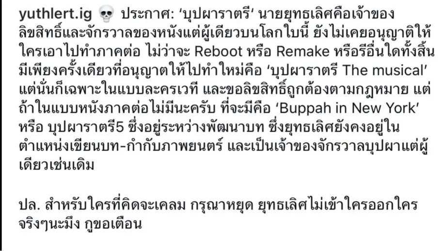 - ประกาศ: ‘บุปผาราตรี’ นายยุทธเลิศคือเจ้าของ ลิขสิทธิ์และจักรวาลของหนังแต่ผู้เดียวบนโลกใบนี้ ยังไม่เคยอนุญาตให้ใครเอาไปทำภาคต่อ ไม่ว่าจะ Reboot หรือ Remake หรือรีอื่นใดทั้งสิ้น มีเพียงครั้งเดียวที่อนุญาตให้ไปทำใหม่คือ ‘บุปผาราตรี The musical’แต่นั่นก็เฉพาะในแบบละครเวที และขอลิขสิทธิ์ถูกต้องตามกฎหมาย แต่ถ้าในแบบหนังภาคต่อไม่มีนะครับ ที่จะมีคือ ‘Buppah in New York’หรือ บุปผาราตรี5 ซึ่งอยู่ระหว่างพัฒนาบท ซึ่งยุทธเลิศยังคงอยู่ในตำแหน่งเขียนบท-กำกับภาพยนตร์ และเป็นเจ้าของจักรวาลบุปผาแต่ผู้เดียวเช่นเดิม