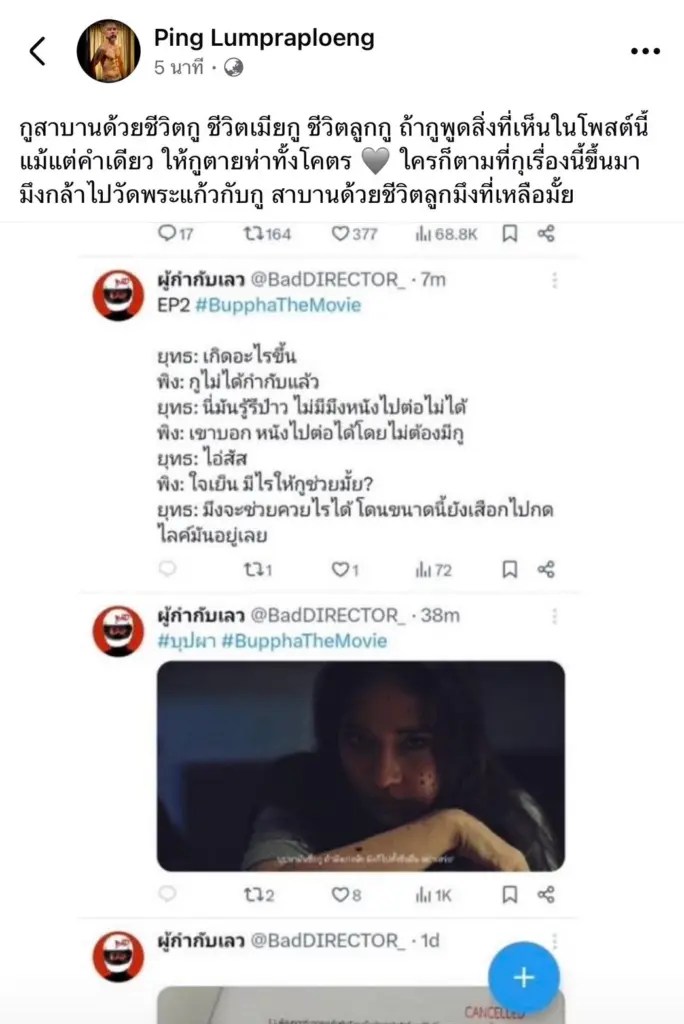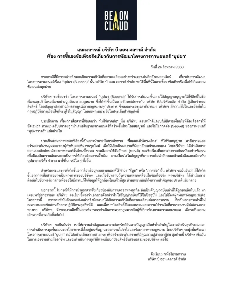 - ล่าสุด บี ออน คลาวด์ (Be On Cloud) บริษัทผู้สร้างภาพยนตร์เรื่อง “บุปผา” ก็ได้โพสต์จดหมายชี้แจงถึงประเด็นการทำภาพยนตร์อย่างละเอียด