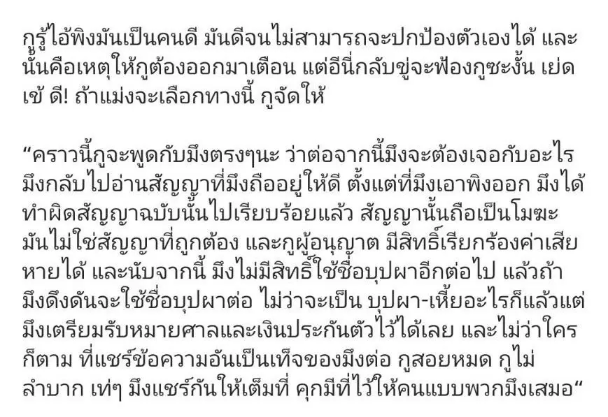 มิงกลับไปอ่านสัญญาทีมิงถีออย่ให้ดี ตังแต่ทีมิงเอาพังออก มิงได้ทำผิดสัญญาฉบับนั้นไปเรียบร้อยแล้ว สัญญานั้นถือเป็นโมฆะ มันไม่ใช่สัญญาที่ถูกต้อง และกูผู้อนุญาต มีสิทธิ์เรียกร้องค่าเสียหายได้ และนับจากนี้ มึงไม่มีสิทธิ์ใช้ชื่อบุปผาอีกต่อไป แล้วถ้า มึงดึงดันจะใช้ชื่อบุปผาต่อ ไม่ว่าจะเป็น บุปผา-เหี้ยอะไรก็แล้วแต่มึงเตรียมรับหมายศาลและเงินประกันตัวไว้ได้เลย และไม่ว่าใคร ก็ตาม ที่แชร์ข้อความอันเป็นเท็จของมึงต่อ กูสอยหมด กูไม่ลำบาก เท่ๆ มึงแชร์กันให้เต็มที่ คุกมีที่ไว้ให้คนแบบพวกมึงเสมอ”