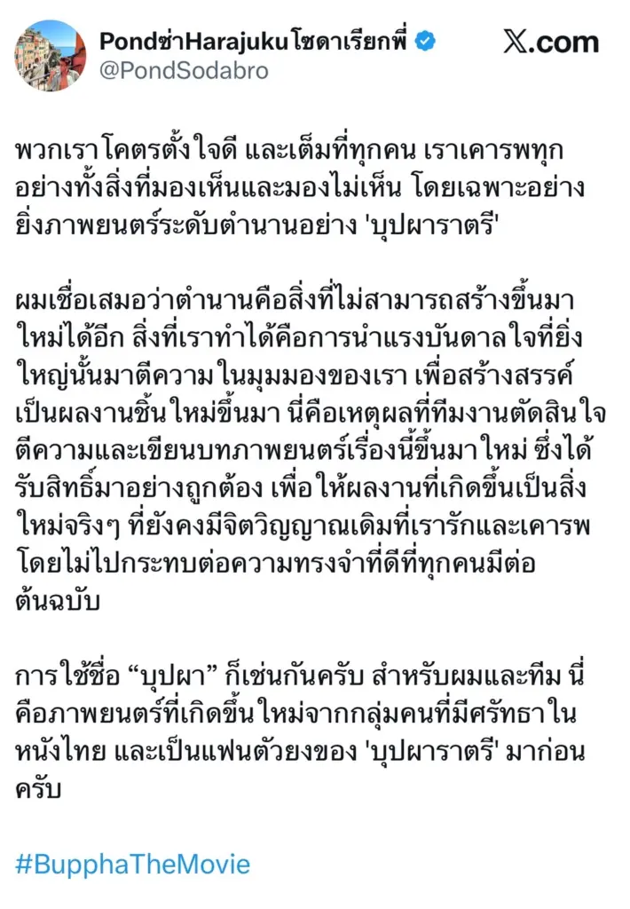 - ยืนยันว่าโปรเจกต์นี้ไม่ได้สร้างมาเพื่อทำลายตำนาน แต่เป็นการตีความใหม่โดยเคารพต้นฉบับ และใช้ชื่อ “บุปผา” อย่างถูกต้องตามสิทธิ์