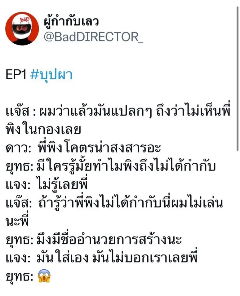 • EP1 เล่าบทสนทนาระหว่าง แจ๊ส ชวนชื่น, ดาว, ยุทธ และแจง โดยมีประเด็นว่าไม่เห็น พิง ลำพระเพลิง ในกองถ่าย ทำให้หลายคนสงสัยว่าทำไมพิงไม่ได้กำกับ ทั้งที่ชื่อแจ๊สกลับไปโผล่เป็น ผู้อำนวยการสร้าง โดยเจ้าตัวยืนยันว่า “เขาไปใส่เอง ไม่ได้บอกเรา”