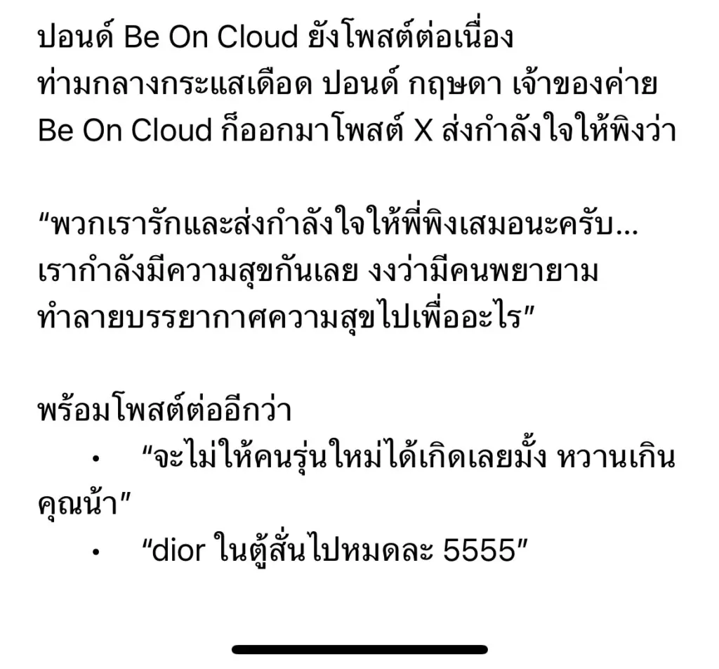 ท่ามกลางกระแสเดือด ปอนด์ กฤษดา เจ้าของค่าย Be On Cloud ก็ออกมาโพสต์ X ส่งกำลังใจให้พิงว่า