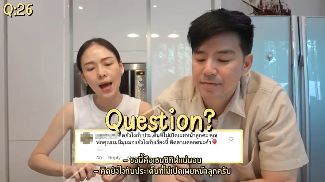 ล่าสุด บีม กวี และ ออย อฏิพรณ์ ได้มีการตอบคำถาม Q&A ต่อประเด็นที่ว่า คิดยังไงกับประเด็นที่ไม่เปิดเผยหน้าลูก คุณพ่อ คุณแม่มีมุมมองยังไงกับเรื่องนี้